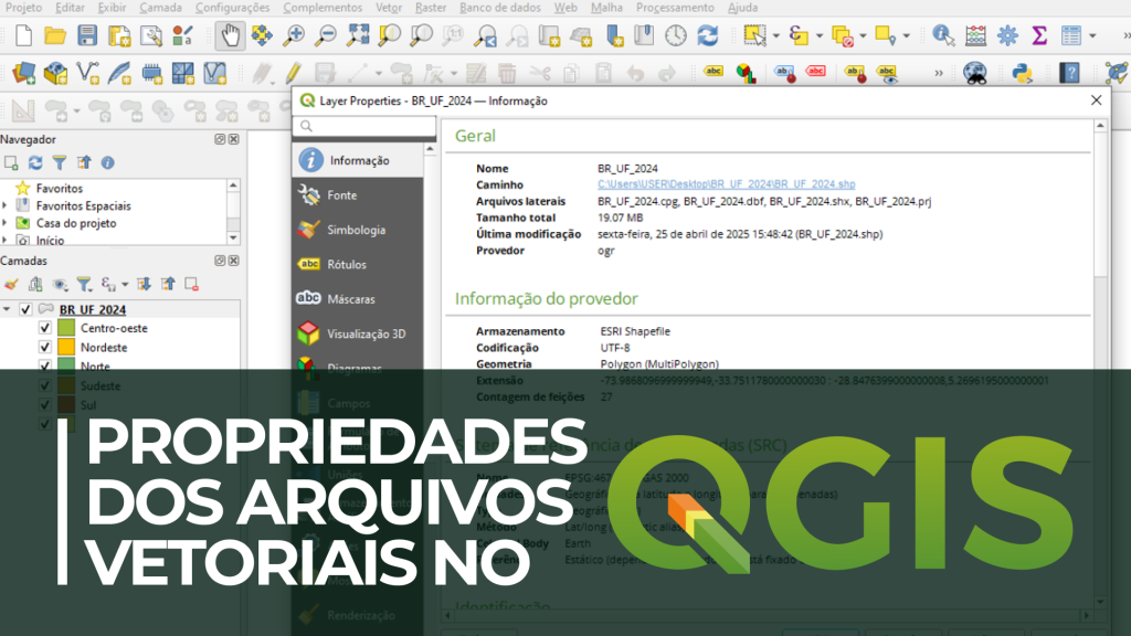 As propriedades de arquivos vetoriais no QGIS controlam como cada camada se comporta no mapa. Nelas você ajusta simbologia, rótulos, metadados e informações.