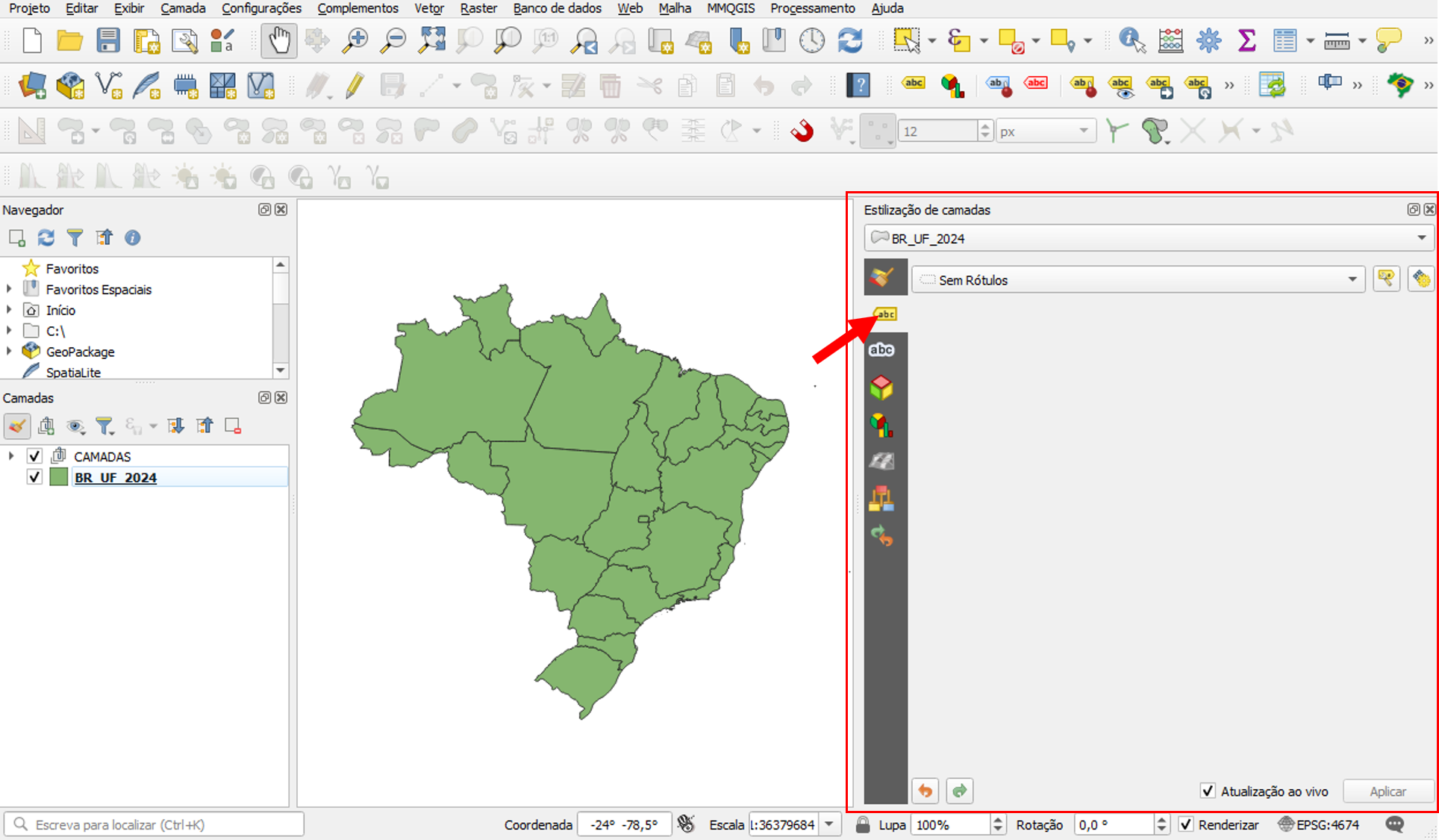 Neste exemplo, vamos utilizar a camada de Unidades da Federação, disponibilizada pelo IBGE. Com uma camada shapefile já adicionada no QGIS, clique na tecla F7 no teclado do seu computador para abrir o painel de Estilização de Camadas. Nesse painel, localize a aba Rótulos e clique sobre ela.