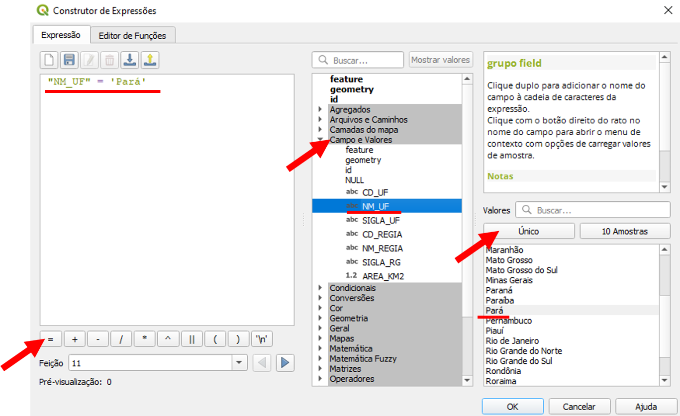 Na janela do Construtor de Expressões, vamos escrever uma regra para rotular apenas o estado do Pará. Para isso, clique em Campos e Valores para exibir a lista de campos da tabela de atributos. Em seguida, dê duplo clique em NM_UF, que é o campo que contém os nomes dos estados brasileiros. Depois, clique no botão = localizado no canto inferior esquerdo da janela. Na sequência, clique em Único, role a lista até encontrar o valor Pará e dê duplo clique sobre ele.
