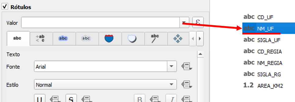 De volta à janela de edição de rótulos, clique em Valor e selecione o mesmo campo usado na regra, que é o NM_UF.