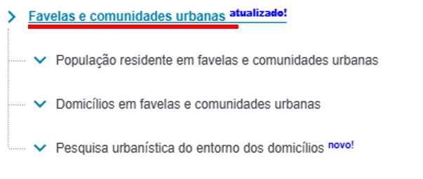 Na plataforma, vá até o menu no lado esquerdo da tela e clique em Favelas e Comunidades Urbanas. Nesse item, você encontra três grupos de dados: população residente em favelas e comunidades urbanas, domicílios em favelas e comunidades urbanas e pesquisa urbanística do entorno dos domicílios.
