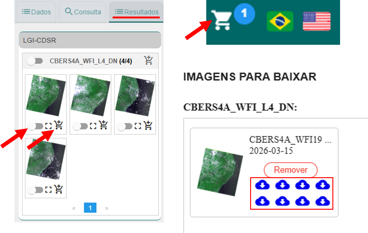 Para acessar os itens selecionados, clique no ícone de carrinho localizado no canto superior direito da tela. Em seguida, a plataforma exibirá as imagens escolhidas. Para baixar, clique nos ícones de nuvem azul. Cada ícone corresponde a uma banda espectral e o seu respectivo arquivo XML.