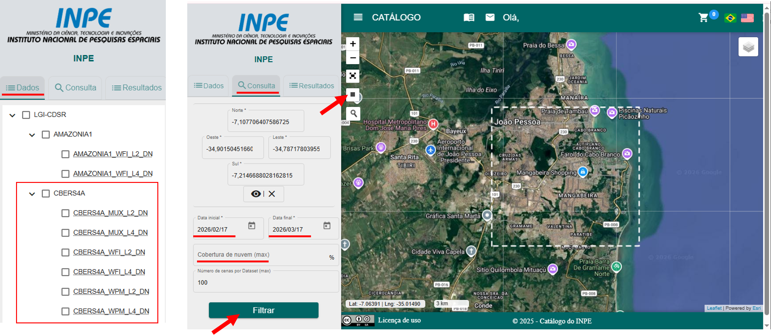 Em seguida, vá até a guia Consulta, navegue pelo mapa e use a ferramenta Draw a Rectangle para delimitar sua área de interesse. Depois, defina o período das imagens e a porcentagem de cobertura de nuvens. Por fim, clique em Filtrar para visualizar e selecionar os resultados disponíveis.