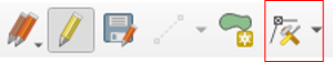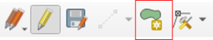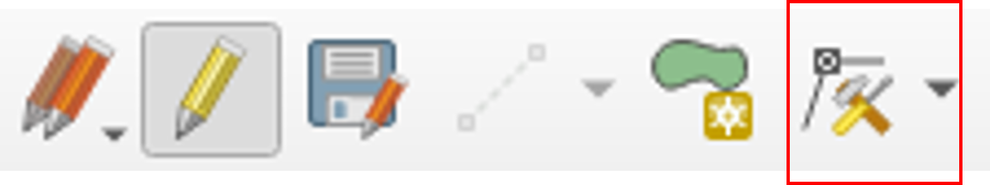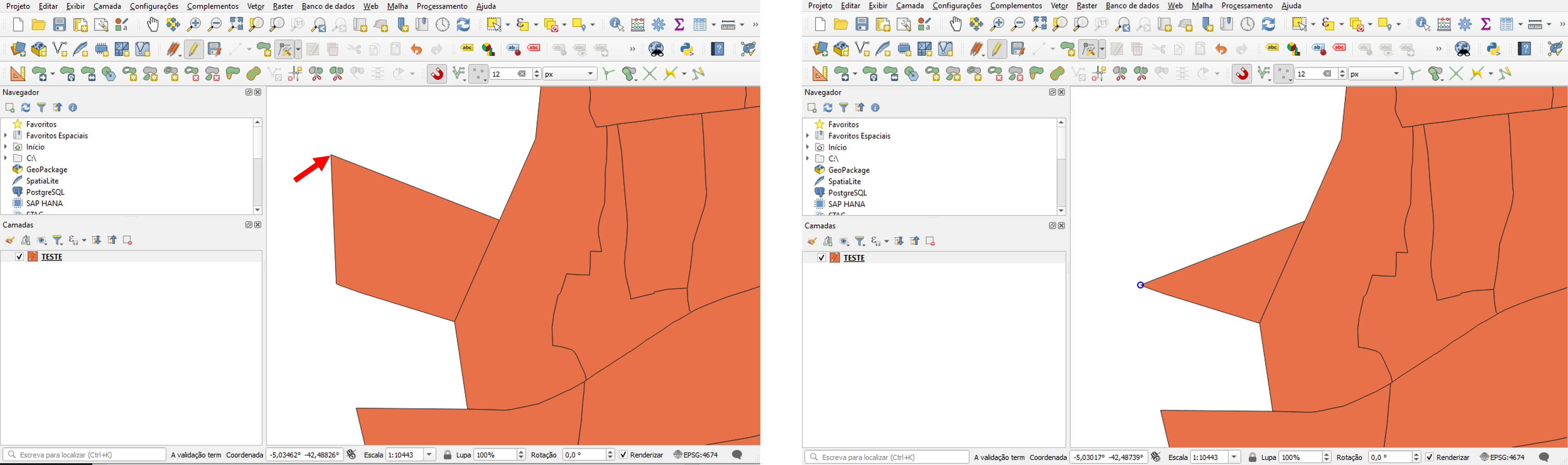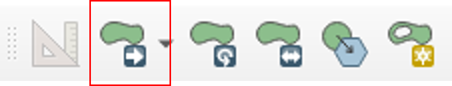 Clique na ferramenta Ferramenta de Vértices. Ao passar o mouse sobre as feições o QGIS mostrará todos os vértices da destacados. Cada vértice pode ser movido, para fazer isso clique e arraste um vértice para reposicionar.