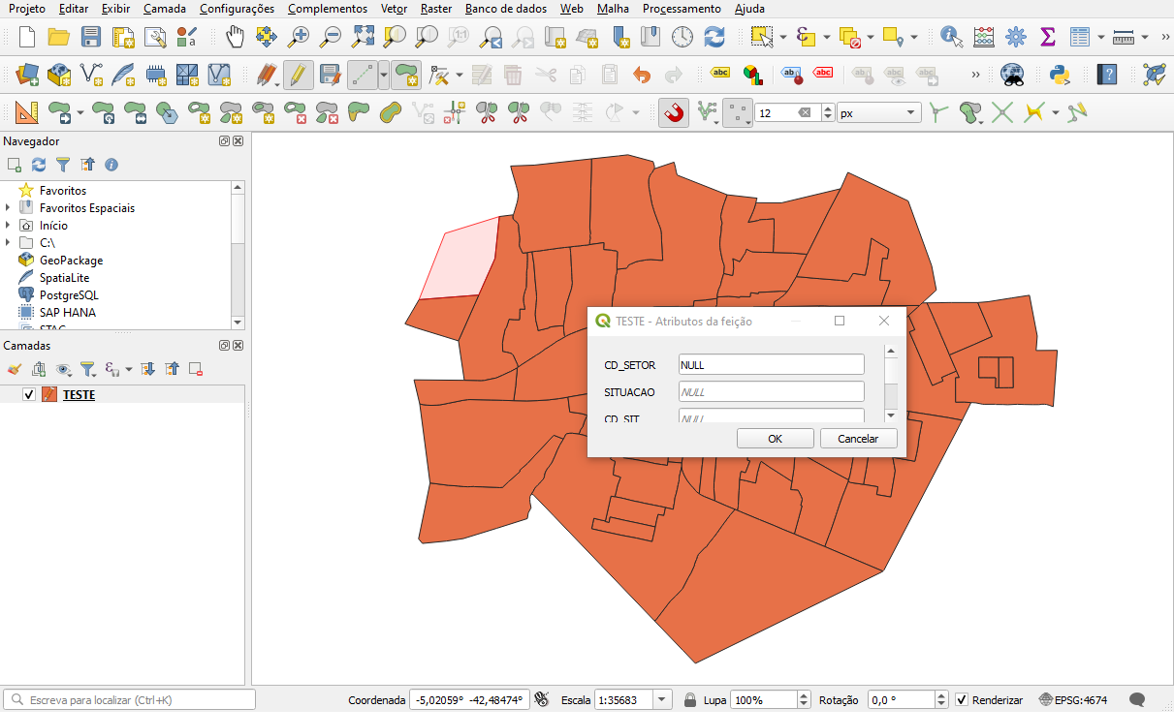 Para criar novas feições, clique em Adicionar Feição. O cursor mudará de forma e ficará semelhante a um alvo. Desenhe a feição dando cliques, quando finalizar clique com o botão direito do mouse. Em seguida o QGIS solicitará que sejam preenchidos os campos da tabela de atributos. Para finalizar clique em OK.