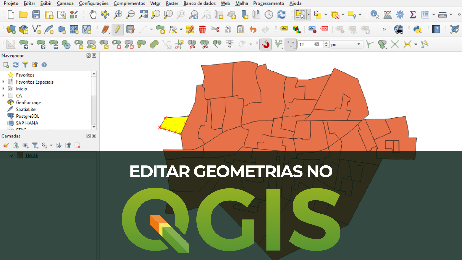 Arquivos vetoriais são estruturas formadas feições e cada feição representa um objeto real. A edição geométrica permite mover vértices, ajustar limites, corrigir contornos, criar ou apagar feições e melhorar a qualidade técnica da base cartográfica.
