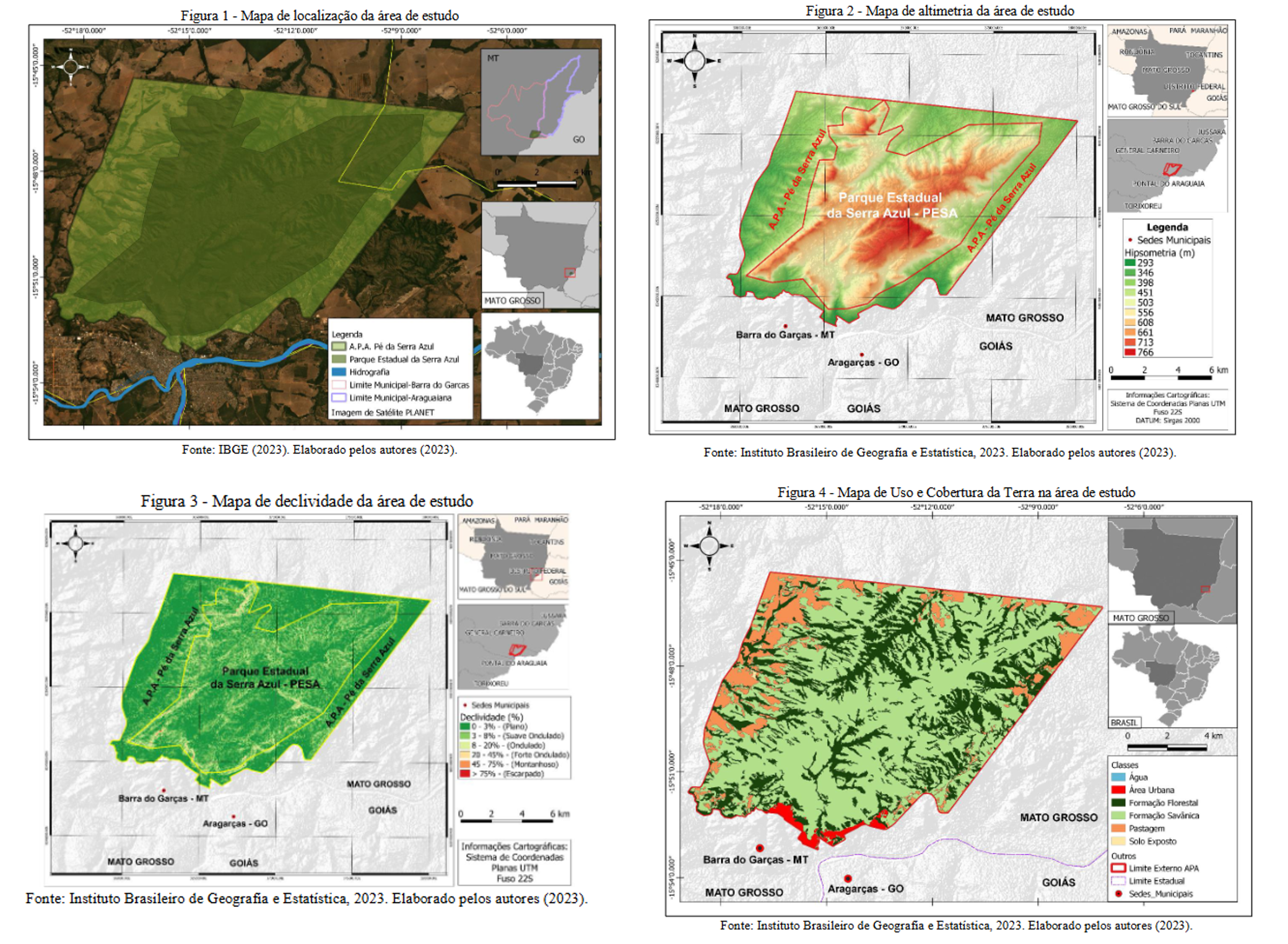O mapa de altimetria revelou que a altitude na área varia de 293 a 766 metros, com predomínio na faixa de 400 a 450 metros. Já a análise da declividade indica que aproximadamente 70,8% da região apresenta relevo ondulado a forte ondulado, caracterizando uma topografia predominantemente inclinada. Em relação ao uso e cobertura do solo, a maior parte (87,58%) é composta por formações vegetais, com predominância savânica, sendo que a principais atividades humanas no local estão relacionadas à pastagem para criação de gado.
