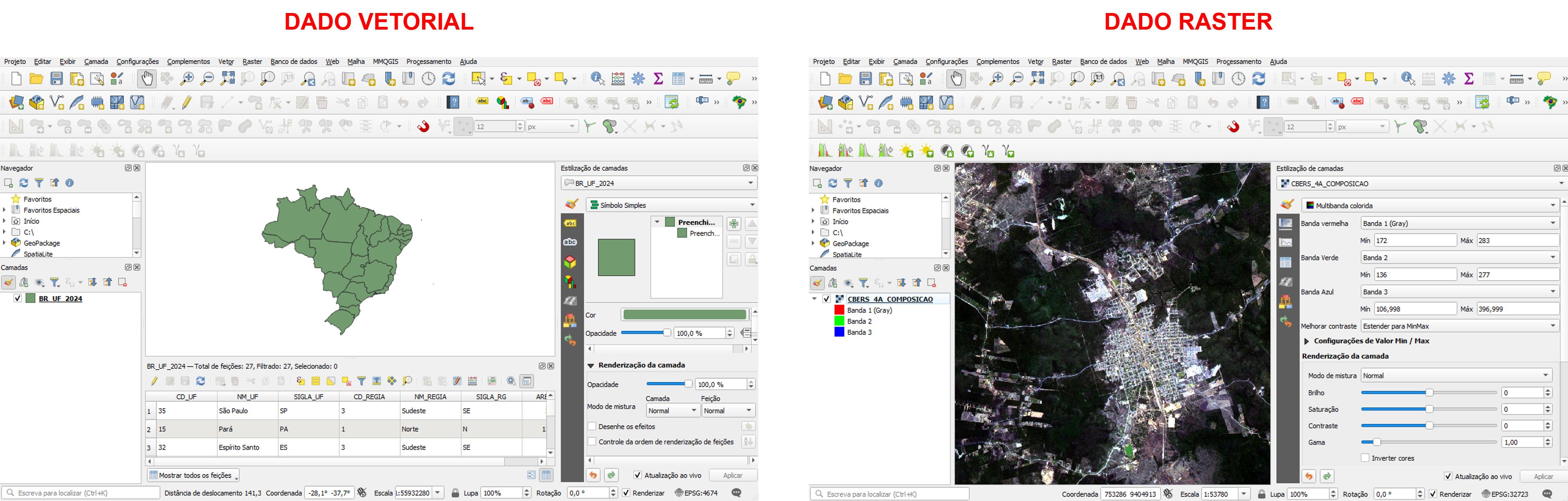 - Dados espaciais: São dados associados a uma localização geográfica. Por exemplo: pontos de escolas, linhas de rodovias e polígonos de municípios.