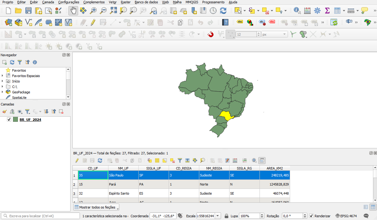 Por exemplo, em uma camada de municípios, cada linha corresponde a um município. As colunas podem conter nome, população, área ou código oficial. Quando você realiza filtros, cálculos ou classificações temáticas, o QGIS usa esses campos para gerar os resultados no mapa.