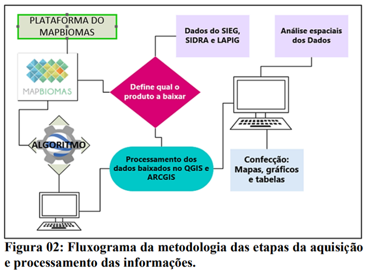 A pesquisa adotou uma metodologia baseada na aquisição, processamento e análise de dados geoespaciais por meio de técnicas de sensoriamento remoto e geotecnologias gratuitas. Foram utilizados dados do MapBiomas, acessados via Google Earth Engine, assim como do Sistema Estadual de Geoinformação de Goiás e do Laboratório de Processamento de Imagens e Geoprocessamento.