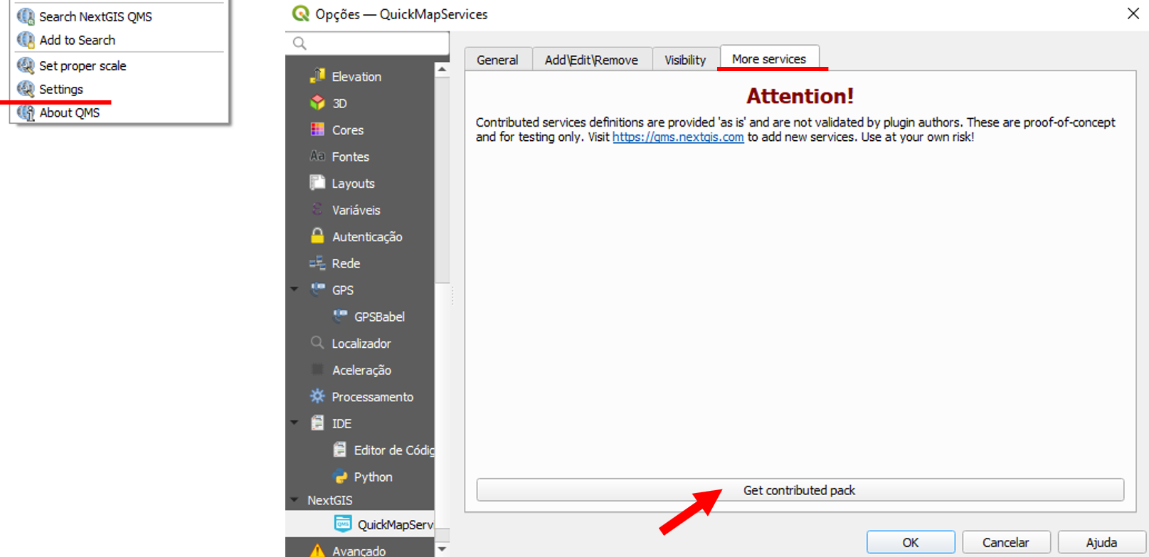 Caso não apareça todas as opções de mapas base, clique em Settings → More services → Get contributed pack para baixar o pacote completo de mapas disponíveis.