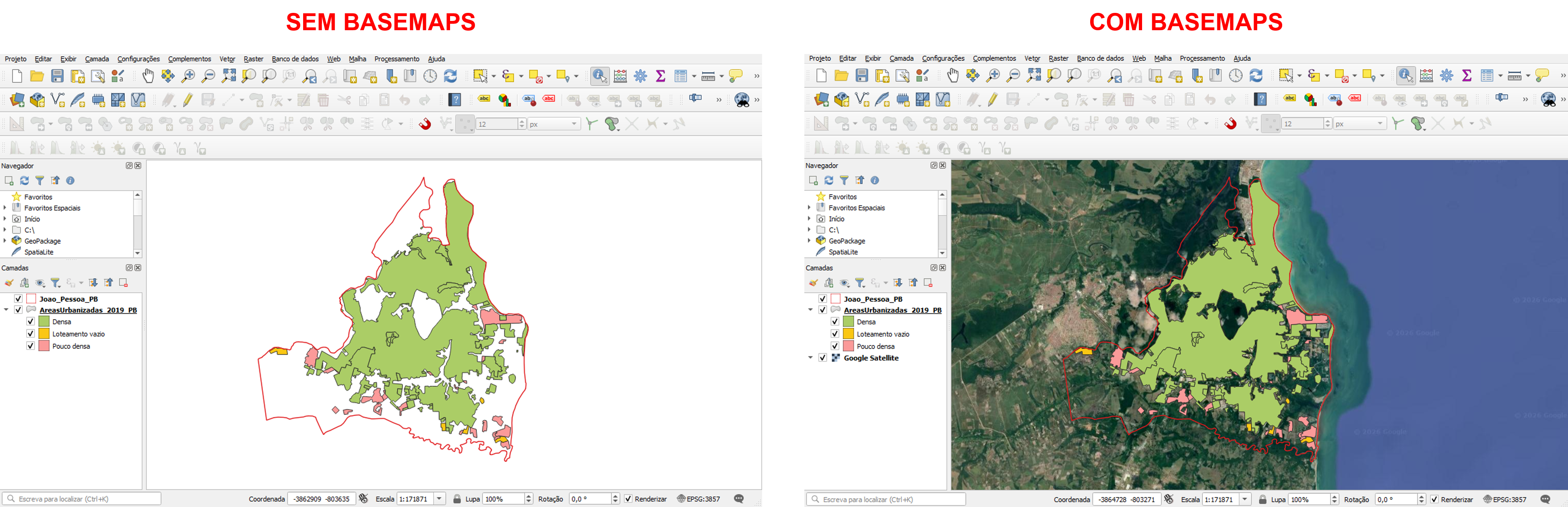 Sem basemaps, você trabalha no escuro, no entanto, com o QuickMapServices no QGIS, você ganha referência visual imediata.