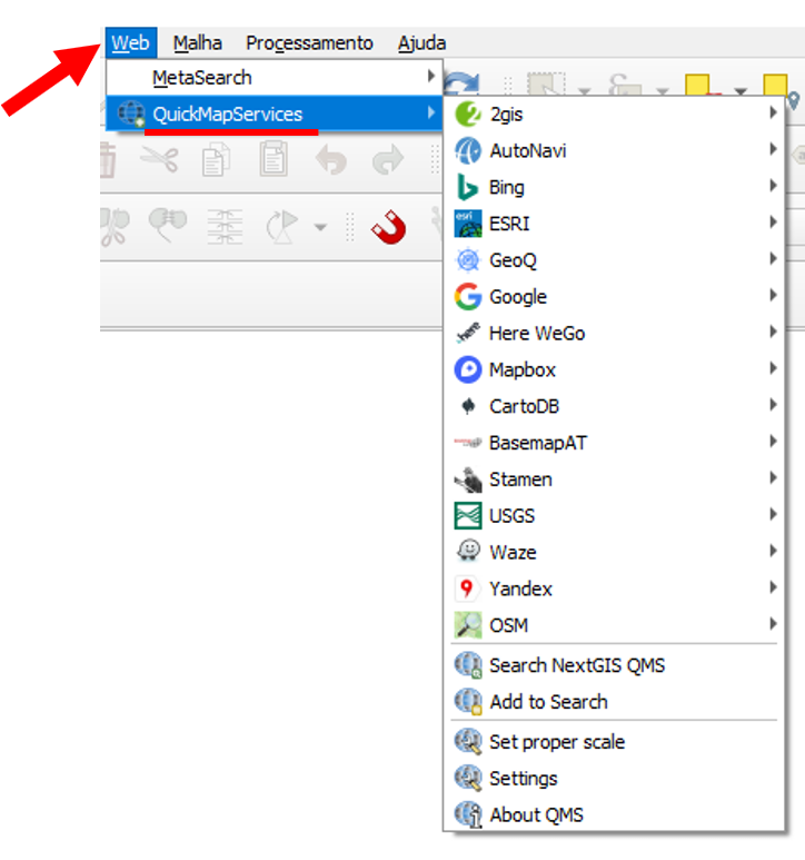 Após instalar o plugin, acesse-o clicando no menu Web → QuickMapServices.