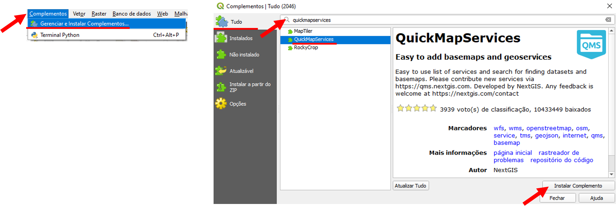 Para instalar o complemento QuickMapServices no QGIS, clique no menu Complementos → Gerenciar e Instalar Complementos. Na janela seguinte, clique em Tudo e use o campo de busca para digitar o nome do plugin. Posteriormente, selecione o complemento na lista e clique em Instalar Complemento. Aguarde a confirmação da instalação e clique em Fechar.